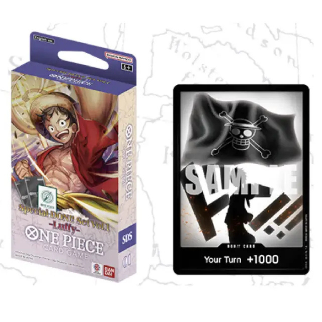 One Piece TCG - Luffy - Special Don Set Vol.1. This set comes with 2 booster packs and a DON!! card featuring a special illustration of Ace, Sabo & Luffy.