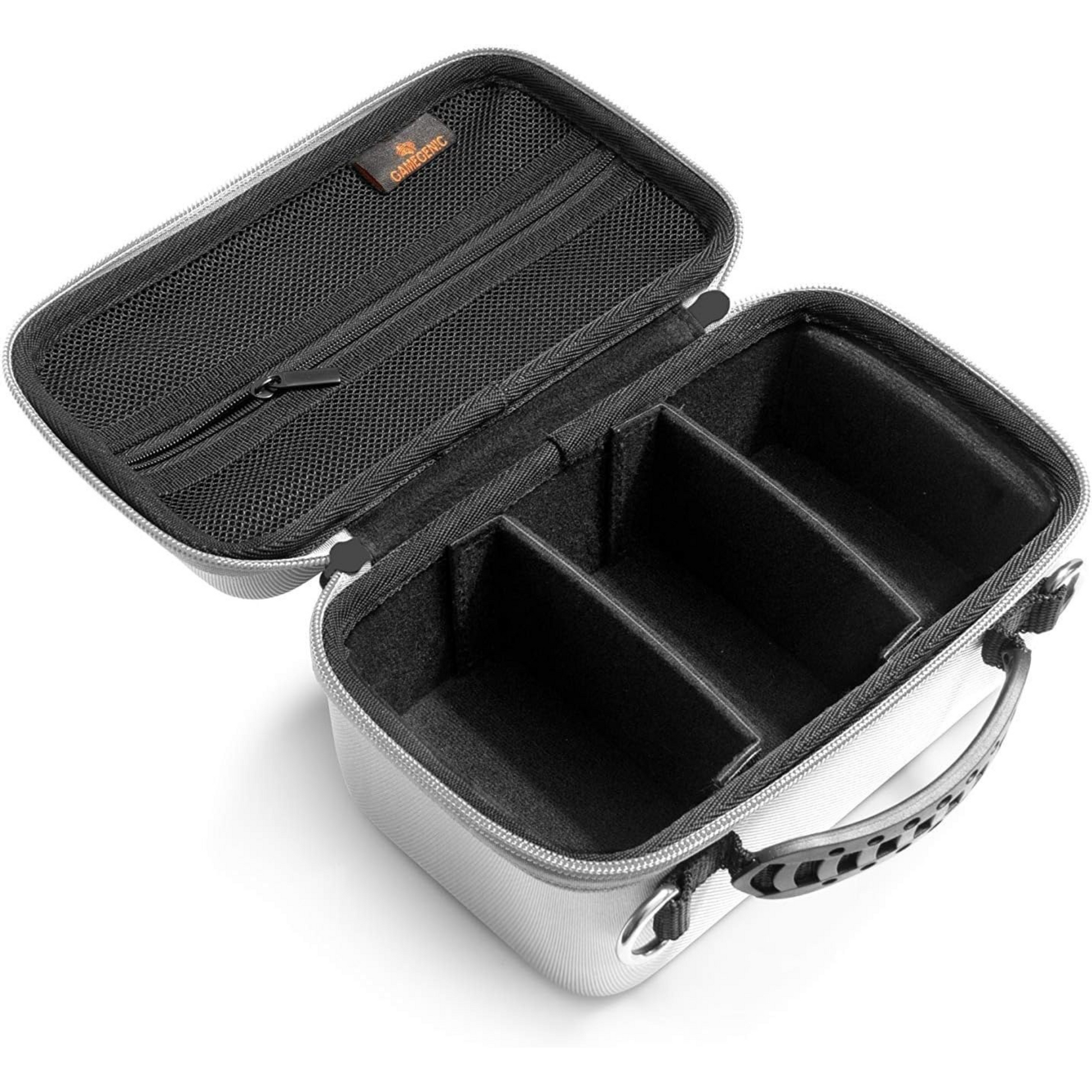 The Card Shell is a portable case, perfectly sized for a wide variety of usages. It fits several TCG decks, tokens, dice or even complete small games. The outside material comes in durable and resistant nylon with a premium structure. It boasts a reinforced handle and two zippers, hidden and protected by the outer material. On the inside, the Card Shell provides an accessories compartment and two adjustable dividers. This enables a completely free setup, adjustable to your needs and preferences. Holds 250+ cards.